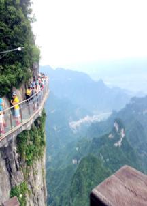 7日早上,我們來(lái)到了此行第一站——天門(mén)山。天門(mén)山海拔1500多米,因自然奇觀天門(mén)洞而蜚聲世界,被譽(yù)為“湘西第一神山”和“武陵之魂”。我們乘著觀光大巴沿著逶迤曲折的公路盤(pán)旋而上,只見(jiàn)壁立千仞,懸崖萬(wàn)丈,每逢轉(zhuǎn)彎,車內(nèi)一片驚呼,盡顯刺激與緊張。下車后,我們繼續(xù)前行,當(dāng)大家爬過(guò)999層階梯最終到達(dá)巨大的天門(mén)洞前時(shí),不禁感嘆大自然的鬼斧神工,神秘玄奇。往下眺望,林木蒼翠,山腳下的湖波像綠寶石一樣鑲嵌其中,美不勝收。清風(fēng)徐來(lái),令人神清氣爽,視野開(kāi)闊,豪氣頓生。天門(mén)山上的玻璃棧道,依峭壁凌空而建,讓人望而生畏,行而卻步。大家都小心翼翼,體驗(yàn)雙腳處于萬(wàn)丈深谷之上的驚險(xiǎn)。