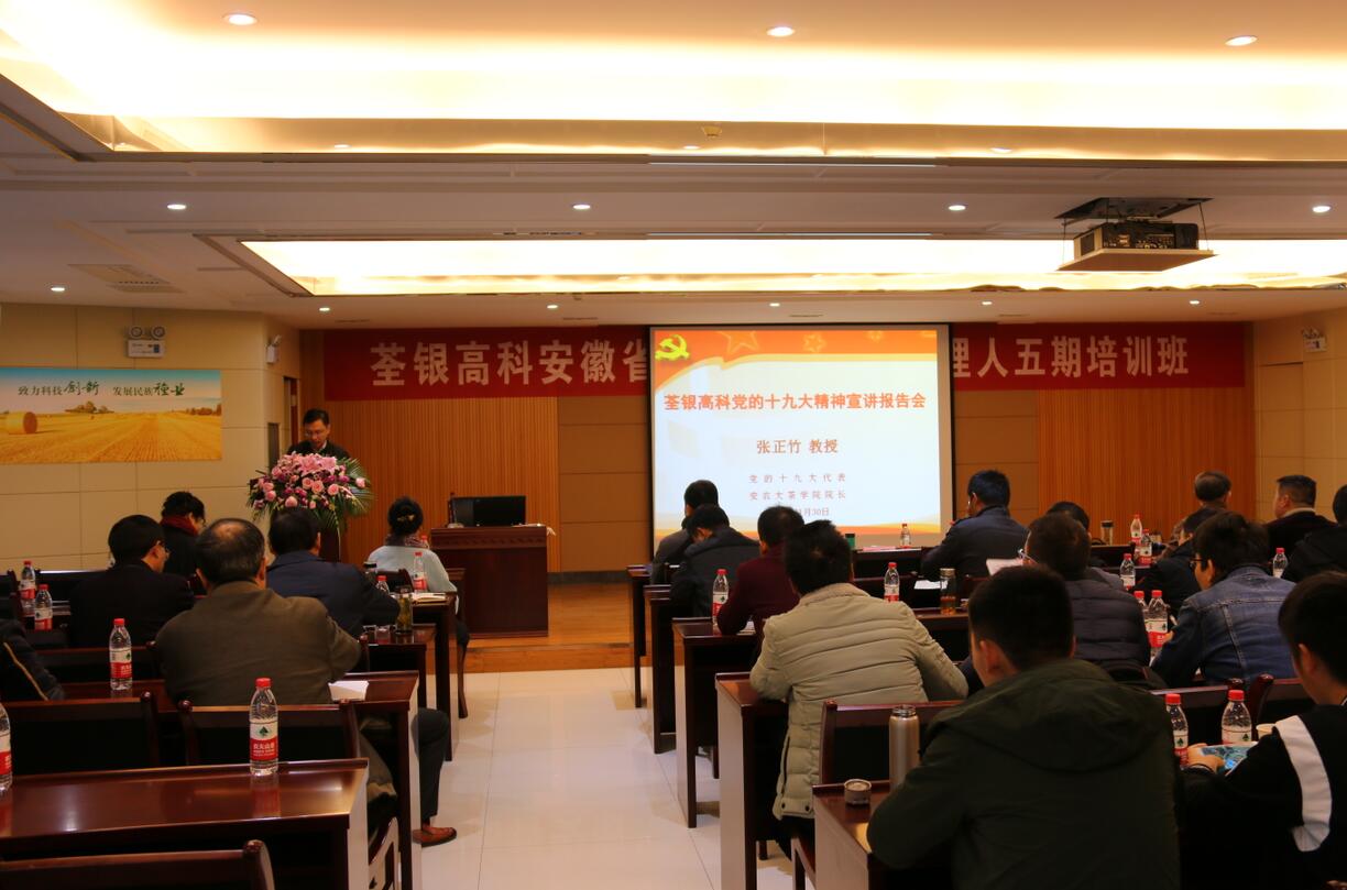 2017年11月30日上午,為深入學(xué)習(xí)宣傳中國共產(chǎn)黨第十九次全國代表大會(huì)精神,荃銀高科邀請黨的十九大代表、安徽農(nóng)業(yè)大學(xué)茶與食品科技學(xué)院院長張正竹教授來公司作黨的十九大精神宣講。宣講報(bào)告會(huì)在荃銀高科六樓多功能廳舉行,公司經(jīng)營班子成員、全體黨員、安徽省首屆農(nóng)業(yè)職業(yè)經(jīng)理人學(xué)員以及公司部分員工參加了學(xué)習(xí)。會(huì)議由公司黨支部書記廖孝波主持。